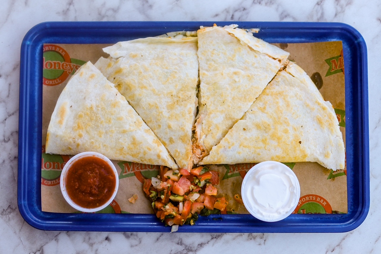 Ranch, mozzarella, shredded chicken, bacon and green onions in a toasty flour tortilla with sour cream and salsa on the side.
