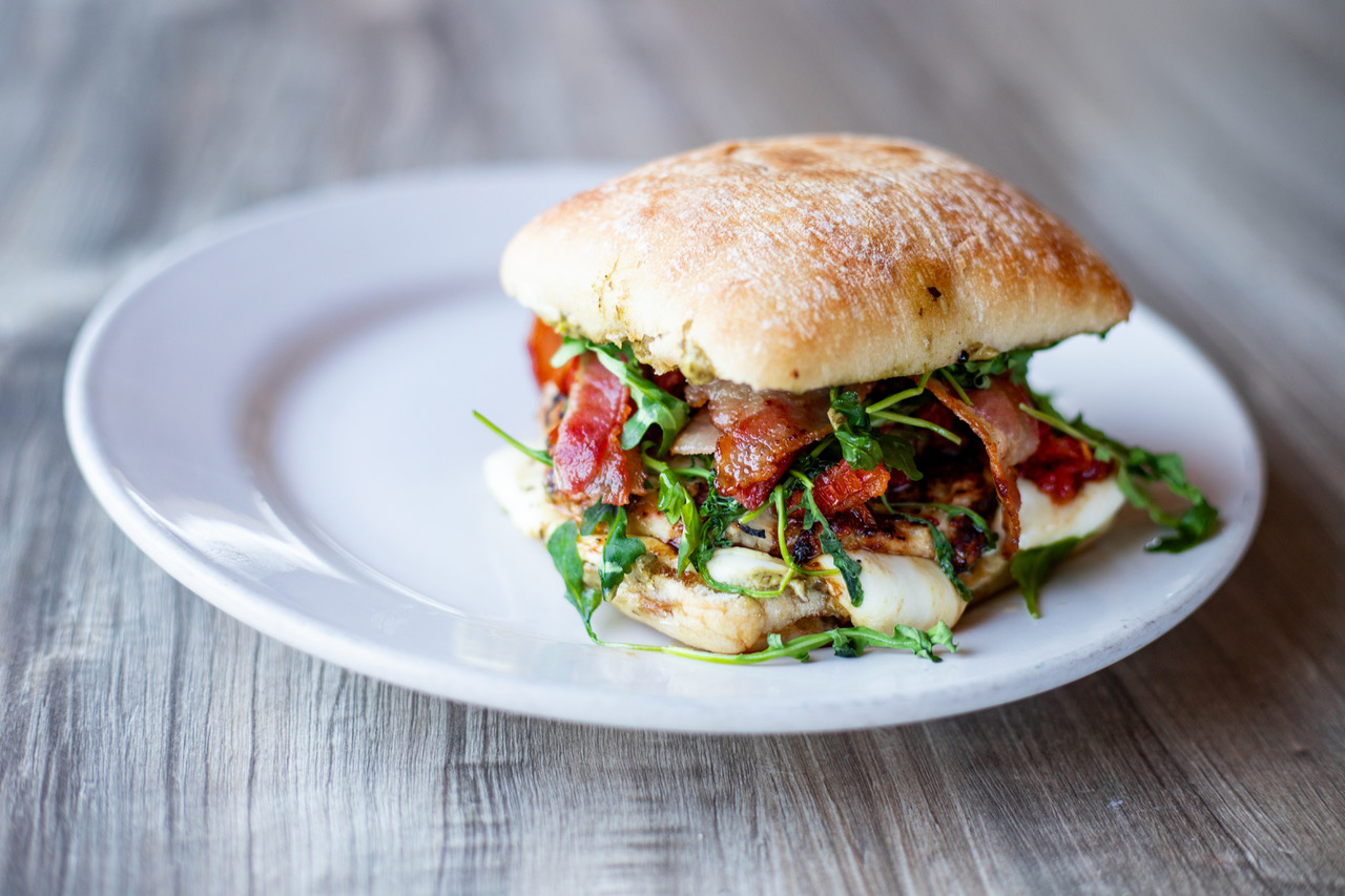 Grilled chicken on a ciabatta roll with pesto, bacon, fresh mozzarella, sun dried tomatoes and arugula. Served with choice of fries or chips.
