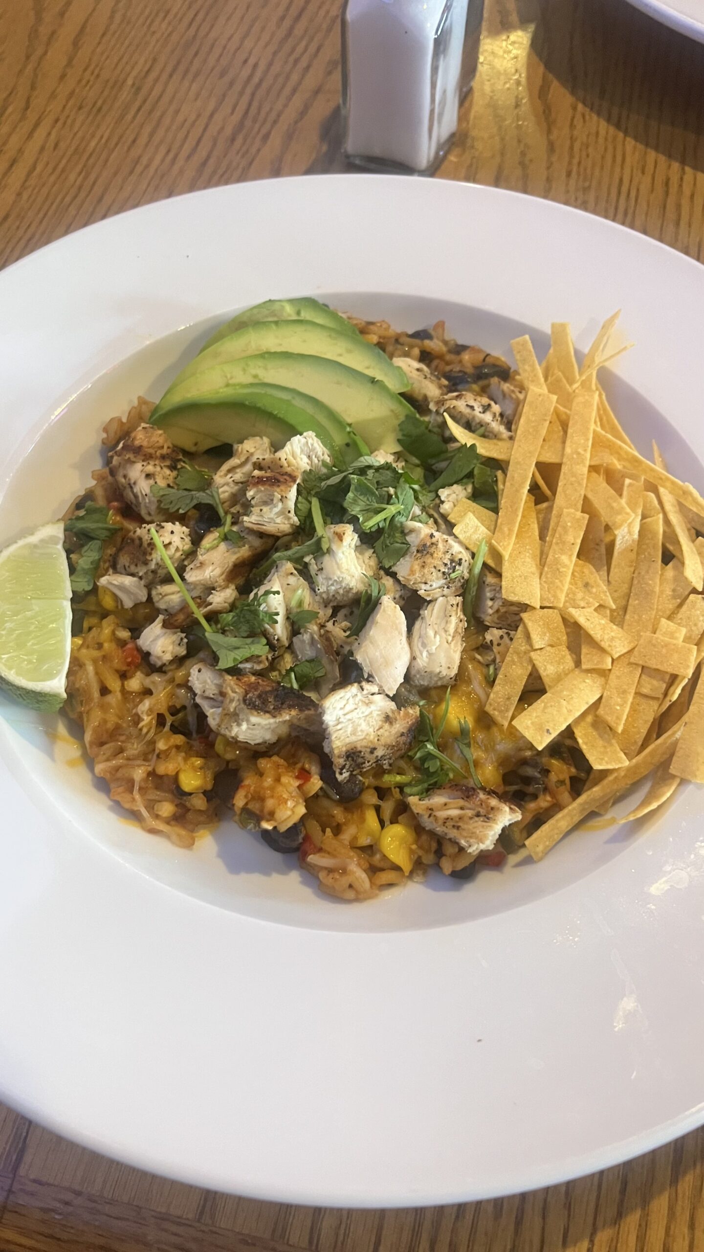 Southwest basmati rice topped with diced grilled chicken, cheddar jack cheese, avocado, cilantro and crispy tortilla strips.Ā