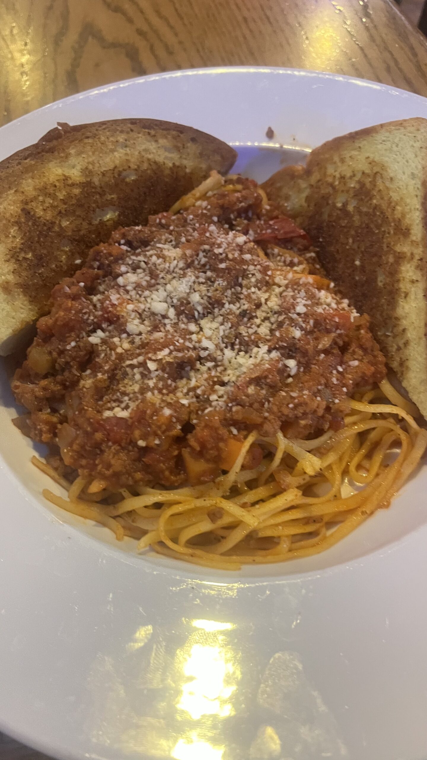 Linguini topped with our house made bolognese sauce. Sprinkled with parmesan and served with garlic toast.